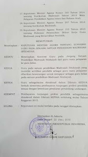 Tanggal 22 Juni 2016 silam, Kementerian Agama Republik Indonesia menerbitkan Keputusan Menteri Agama (KMA) Nomor 303 Tahun 2016 wacana Konversi Guru pada Jenjang Satuan Pendidikan Madrasah Ibtidaiyah. Keputusan yang ditandatangani pribadi oleh Menteri Agama, Lukman Hakim Saifuddin ini dalam amar putusannya, berisikan: